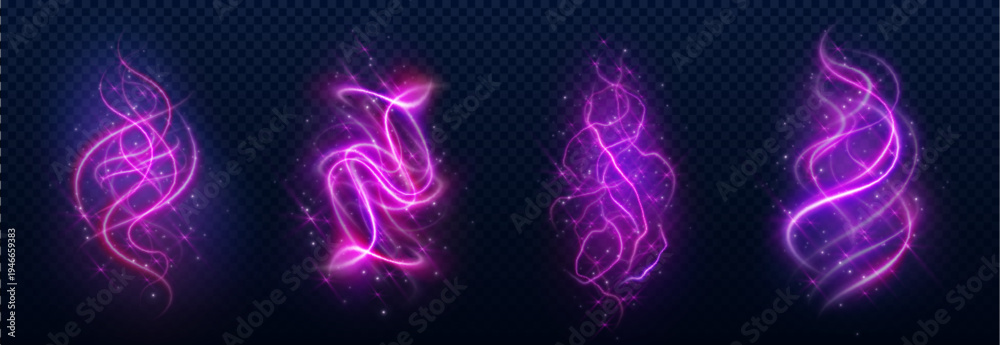 • Magic smoke swirls with glowing light effects, fantasy spell design elements, vector set isolated on transparent background. Neon sparkles with purple mystical energy trails, shining particles