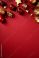 • Elegant Christmas border of golden and red holiday ornaments on a vertical red background.