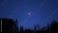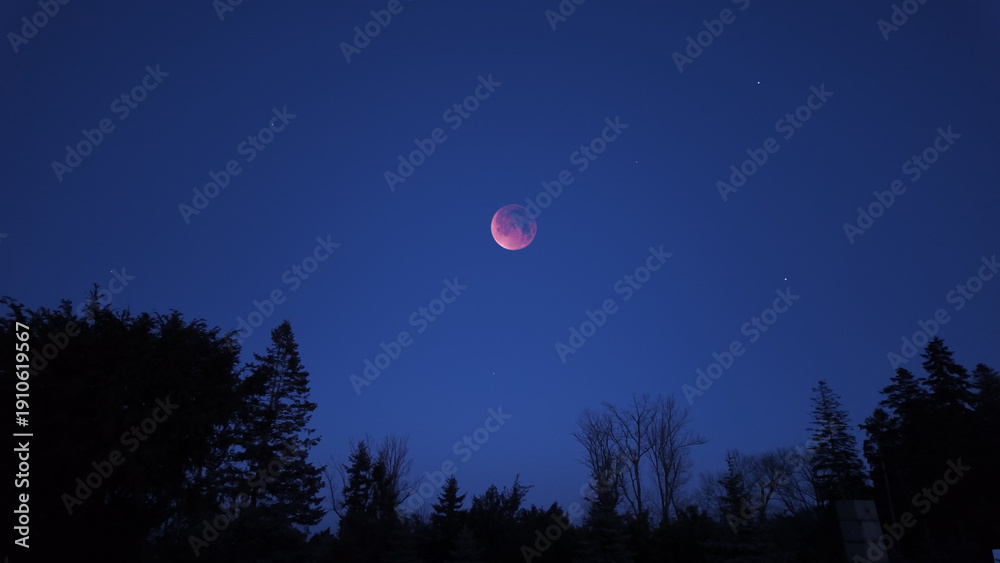 • Blue hour time with lunar eclipse, stars and planets above landscape silhouettes.