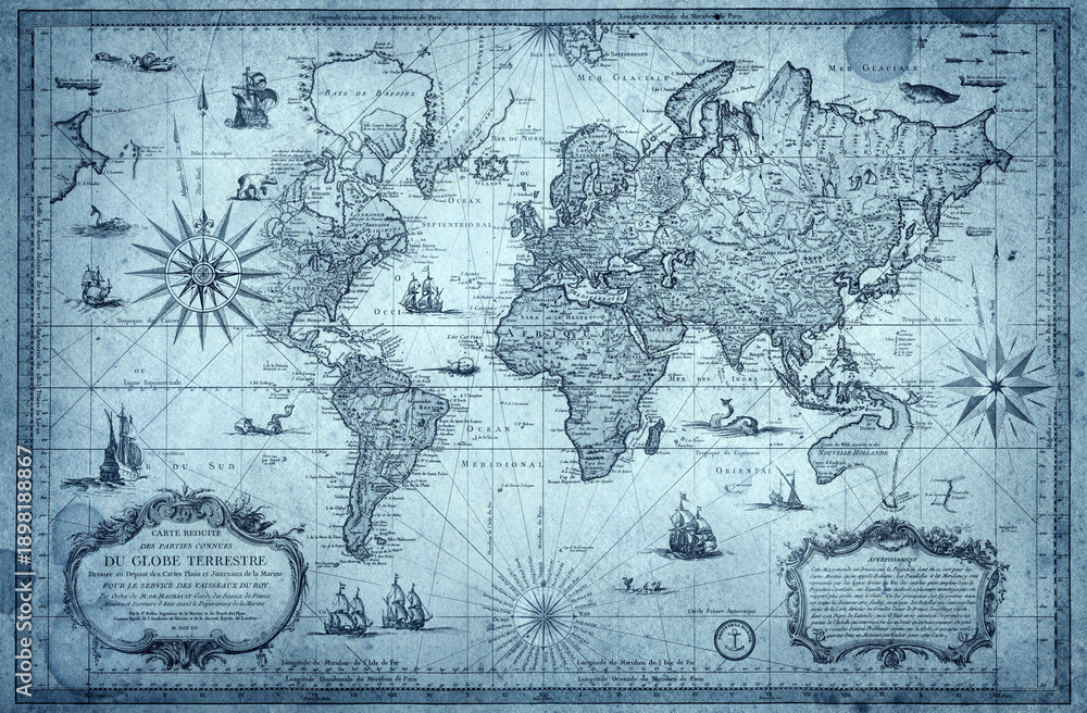 • Antique world map collage inspired by old cartography of the 18, 19 century. Old geographical map with continents, oceans, ships, and compass roses on aged parchment background.