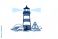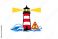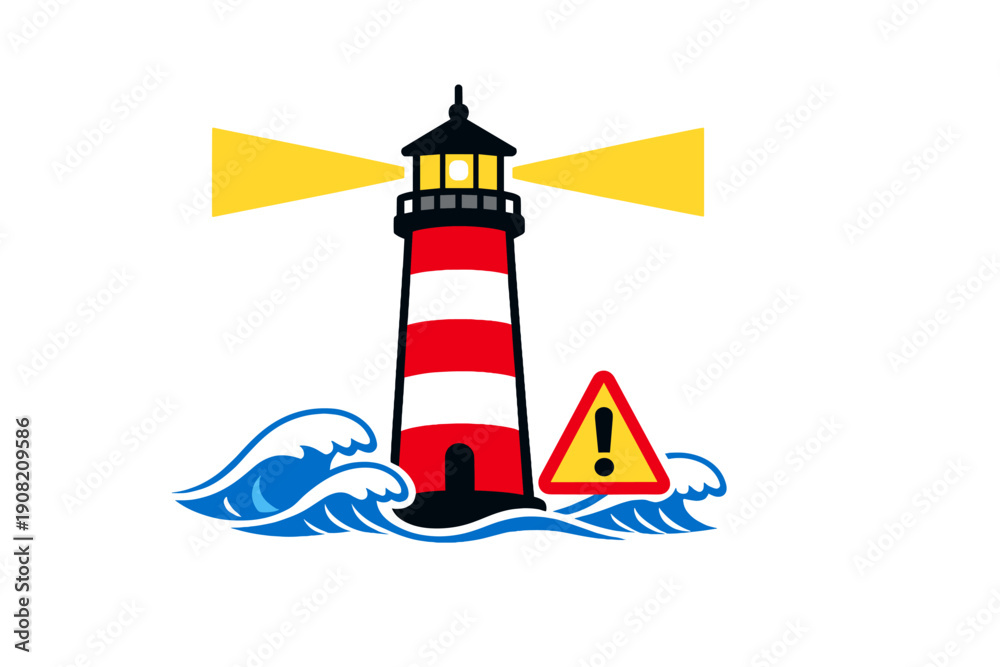• A graphic illustration of a red and black striped lighthouse emitting yellow light beams over blue ocean waves, featuring a yellow warning sign with an exclamation mark.