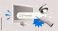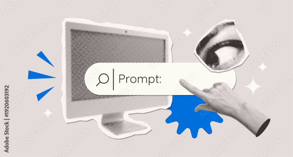 • Halftone Collage of Artificial intelligence and digital technology. Hand gesturing index finger, eye, monitor and prompt bar . AI powered search engine. Generate content. Mixed media vector design