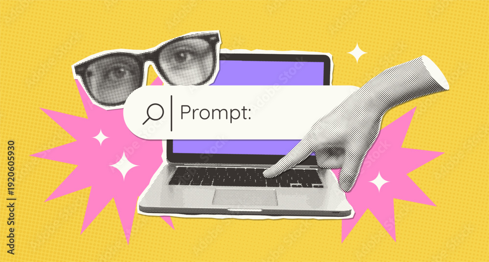 • Trendy halftone collage. Artificial intelligence enabled internet search concept, finding a solution. Laptop with with hand and eyes. The Magic of Creativity with AI. Mixed media vector design