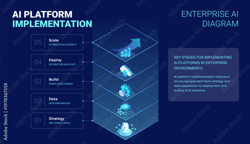 Niebo - AI Platform Implementation diagram illustrating 5 stages Strategy, Data preparation, AI model... #1978367558