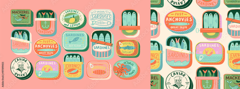 Niebo - Vintage hand drawn canned fish cartoon seamless pattern set. Colorful tinned sardines sea food... #1978911433