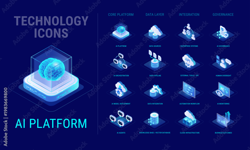 Niebo - Technology icons set for AI Platform system workflow diagram - AI platform, agents network, data,... #1983669800