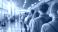 • Crowded airport terminal long queue passport control checkpoint travelers standing line waiting immigration process scene border control area defocused terminal background