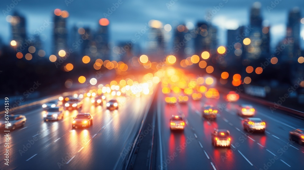 • Blurred Motion Cityscape: Evening Traffic on Highway with City Lights and Bokeh