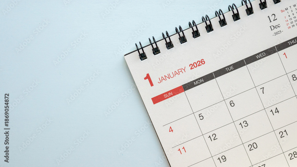 Przestrzeń - January 2026 calendar page on light blue background with copy space for new year planning #1869054872
