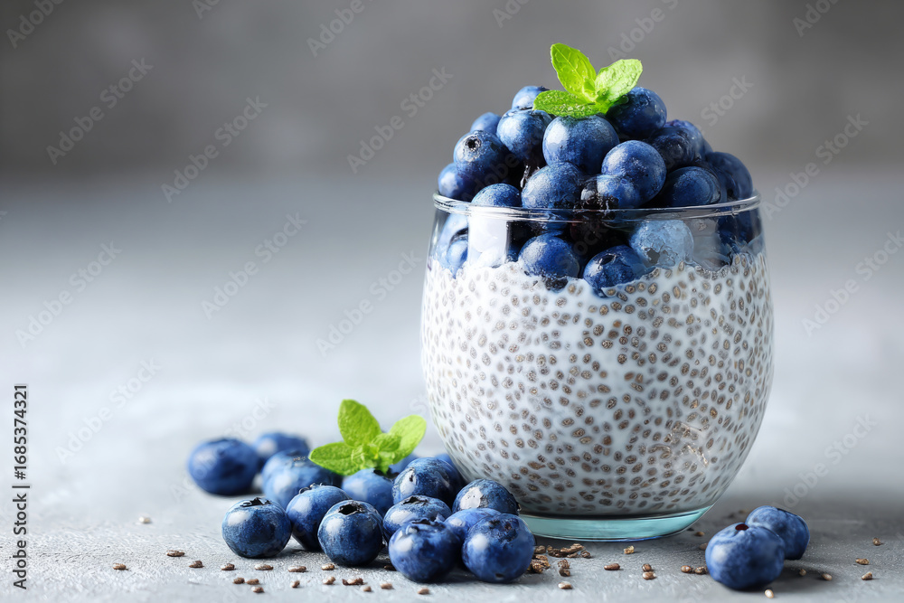 • Chia seeds pudding glasses with blueberries. Healthy breakfast concept