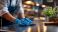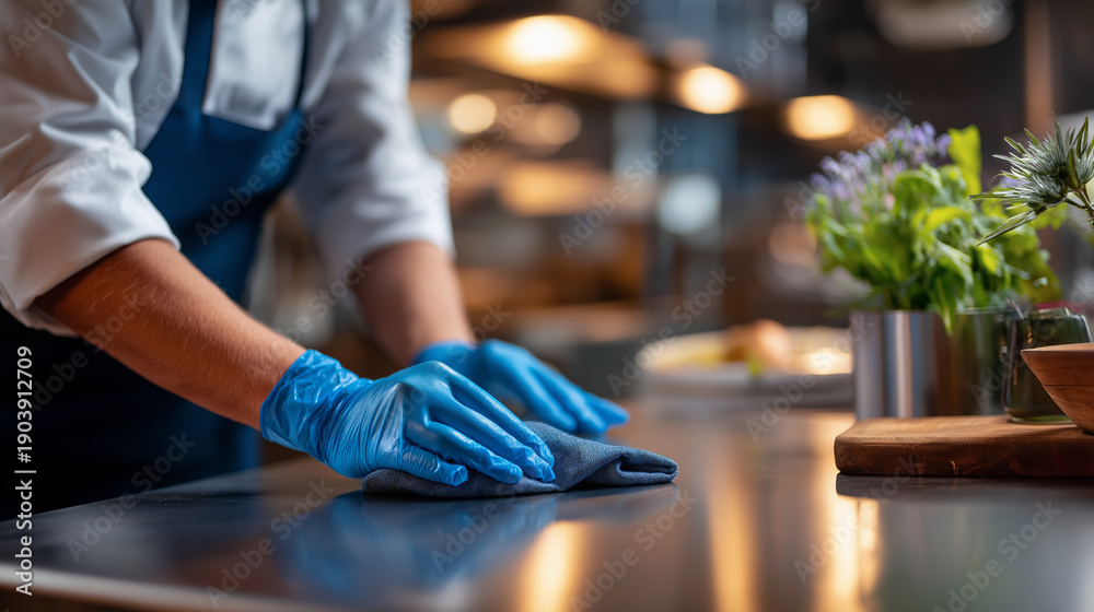 • Professional chef wearing blue nitrile gloves meticulously cleaning and sanitizing gleaming stainless steel kitchen counter surface commercial kitchen hygiene excellence