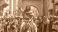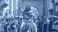 • Biblical palm Sunday scene of Jesus riding a donkey through Jerusalem crowd for religious Easter holy week design.
