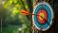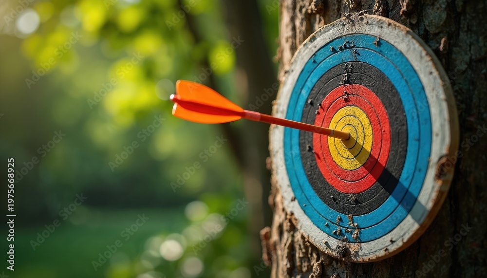 • Orange arrow hits bullseye on colorful archery target. Target mounted on tree trunk in forest. Outdoor sport, focus, precision, accuracy achieved.