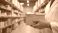 Retro - Pharmacist in white coat and blue gloves holds parcel in warehouse. Ready for shipping medical... #1831191212