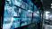 • Medium shot of surveillance wall array in campus security room central monitor showing access control live feed in sharp detail with surrounding screens blurred.