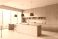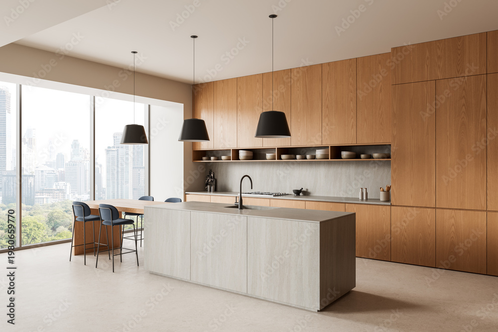 • Modern minimalist kitchen interior with wood cabinetry, large windows, sleek island, pendant lighting, and city view in bright contemporary design. 3D Rendering