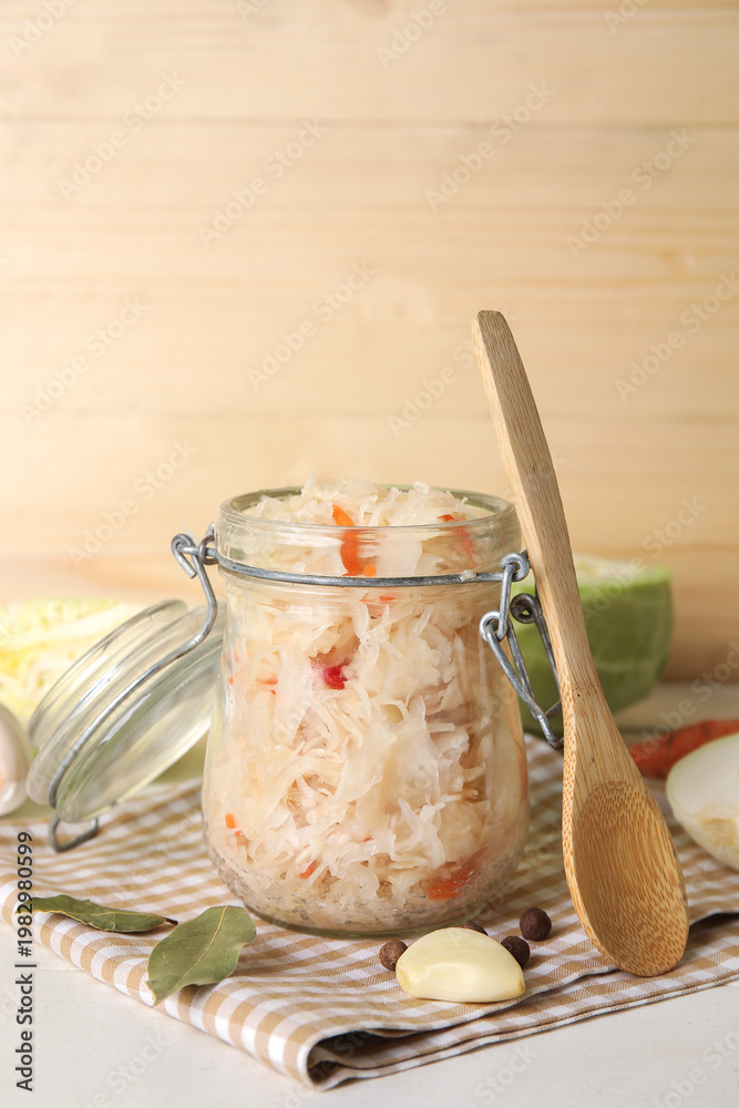 • Tasty sauerkraut in jar with ingredients on wooden background