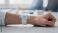 • Medium shot of a wearable smart patch on a forearm with detailed focus on the device as background figures and objects blur softly emphasizing connected health monitoring.