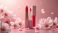 • Luxury pink lipstick and lip gloss sit among delicate cherry blossoms. Pink petals fall softly, creating a romantic spring mood. Elegant beauty products for makeup.
