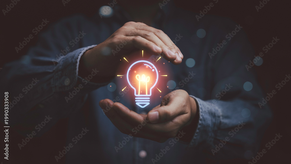 • Creative idea innovation concept with glowing lightbulb in hands, symbolizing inspiration, problem solving, smart thinking and business creativity for generating solutions and driving success.