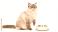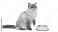 • Elegant feline awaits mealtime. The fluffy cat sits poised with a paw raised near an empty bowl against a stark white background.