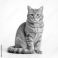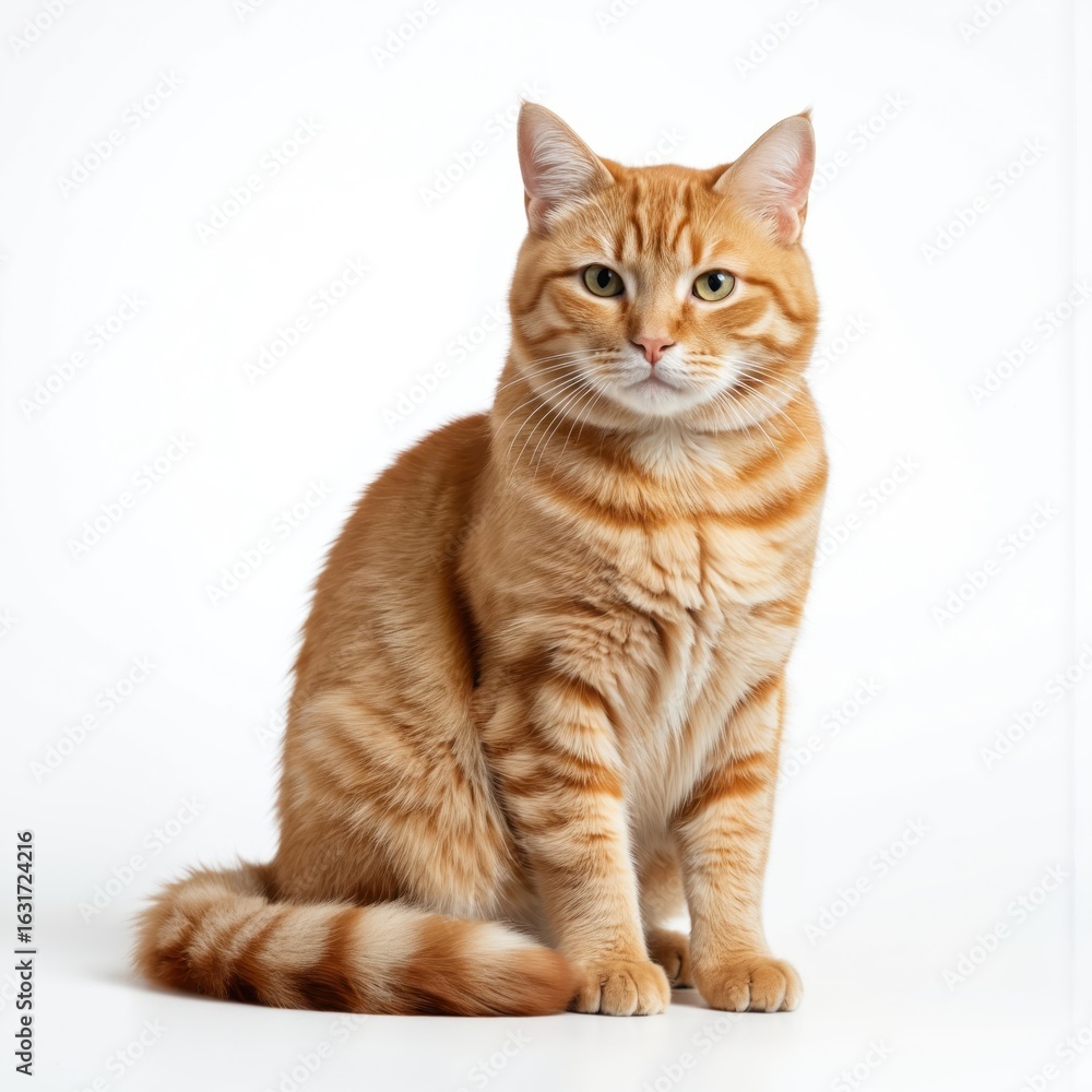 • Ginger British Shorthair cat with striking green eyes sits facing camera on white background. Striped tail held high, adorable fluffy fur, cute features. Full body shot, isolated pet.