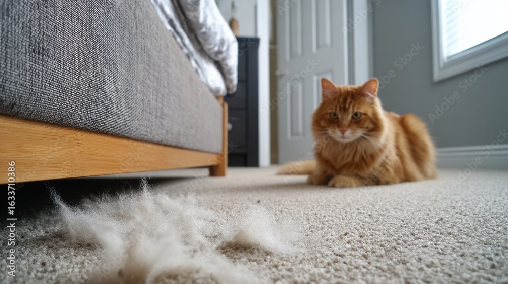 Koty - A ginger cat sits on a carpet near a clump of shed fur, under a bed frame, in a bedroom setting... #1633710386