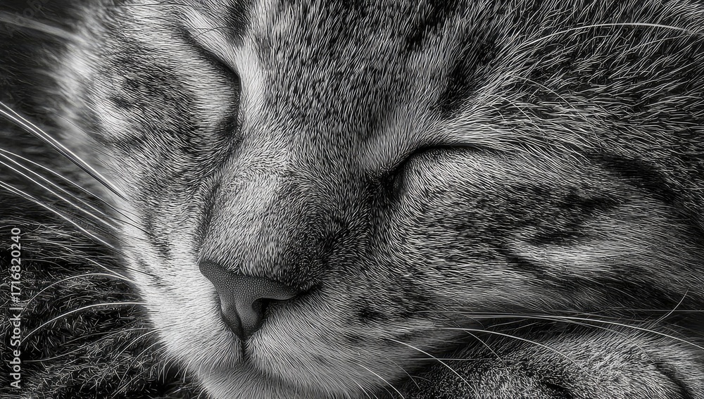 Koty - Close-up black and white photo of a sleeping tabby cat #1716820240