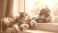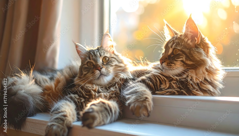 Two fluffy felines relax on a windowsill bathed in warm sunlight. One cat looks upwards, while the other rests, showcasing textures. The blurred background hints at a peaceful day od 0,00 zł Dopasuj i kup