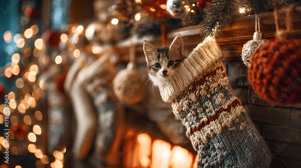 Koty - Cat peeking from cozy Christmas stocking #1786537369