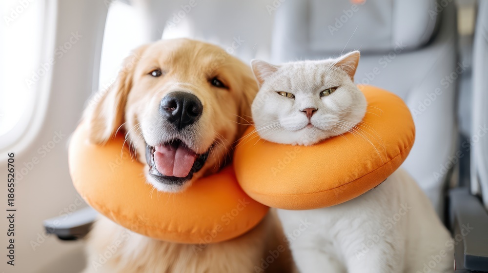 Koty - Happy dog and cat wearing travel neck pillows, sitting together on an airplane seat, showcasing... #1865526706
