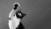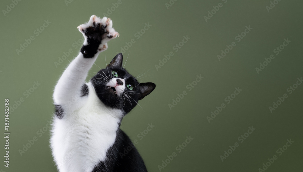 • playful green eyed tuxedo cat with one paw up in the air, studio shot on green background with blank copy space right of the cat