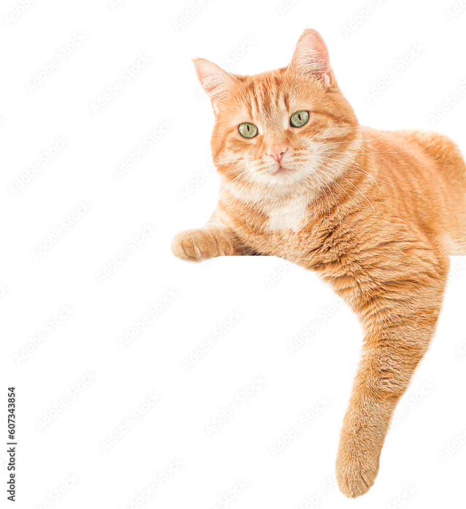 Koty - ginger cat lies on the banner. isolated on white background #607343854