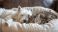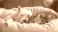 • A cute little white terrier dog and a fluffy cat sleeping together on a pet bed.