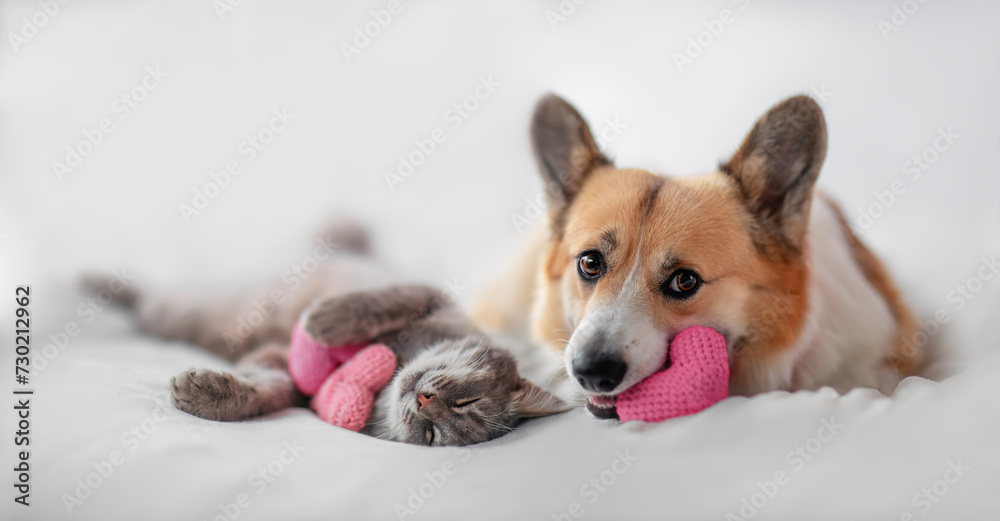 • holiday valentine with cute couple of furry friends corgi dog and cat lying on white bed background with pink hearts symbols
