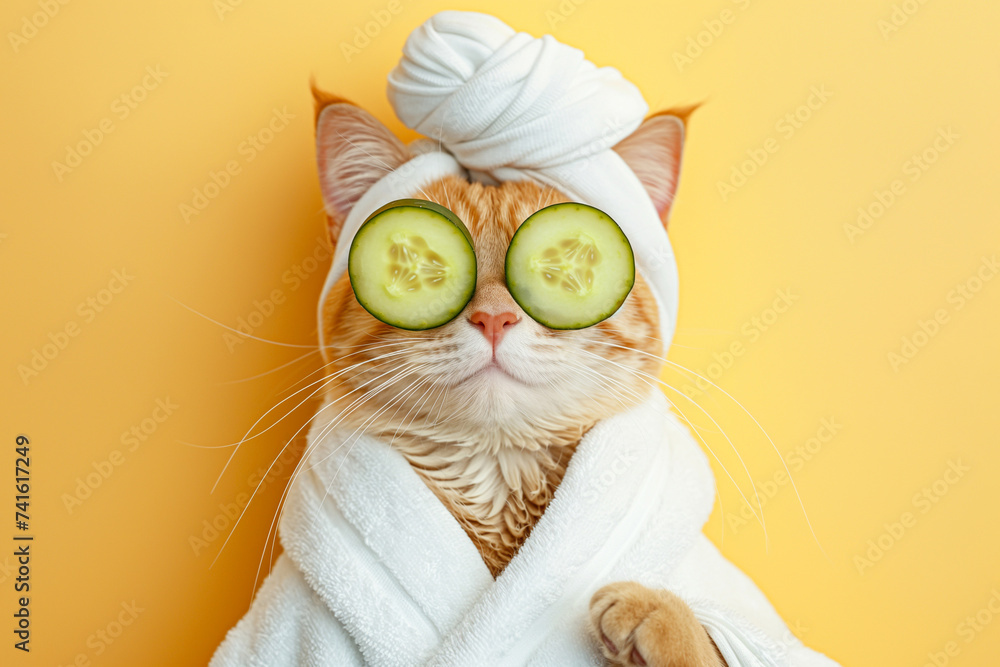 Koty - Cat relaxing in spa with cucumber slices on eyes. Cute cat in a bathrobe and turban on spa... #741617249