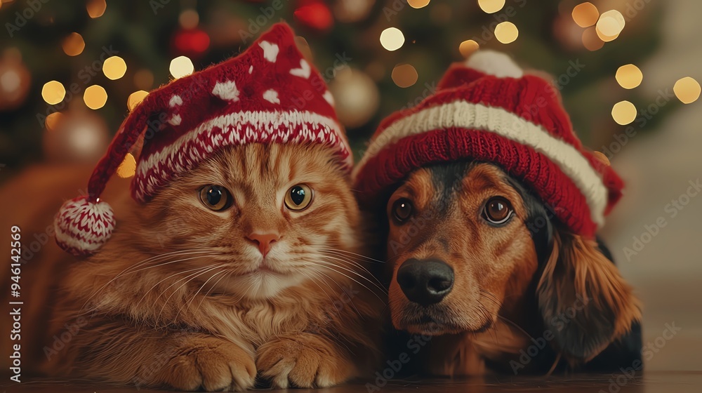 Koty - Festive pets together, a cat and a dog wearing Christmas hats, celebrating the holiday season... #946142569