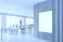 • Modern office interior with vertical wood slat wall and blank poster mockup in open workspace with desks and computers near large windows during daytime. 3D Rendering
