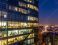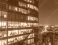 • panoramic view a towering glass skyscraper, where office lights reveal business professional
