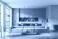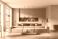 • Modern interior design of open-plan living room and kitchen with minimalist furniture, neutral tones, and stylish marble backsplash. 3D Rendering