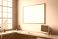 • Blank canvas frame on office wall above modern wooden desk setup with computer and plants in light-filled corner room interior design scene. 3D Rendering