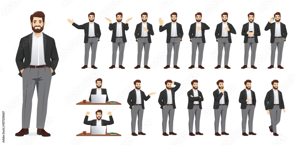• Large set of handsome business man in formal clothes. Different poses and various gestures male character standing and sitting at the desk isolated vector illustration