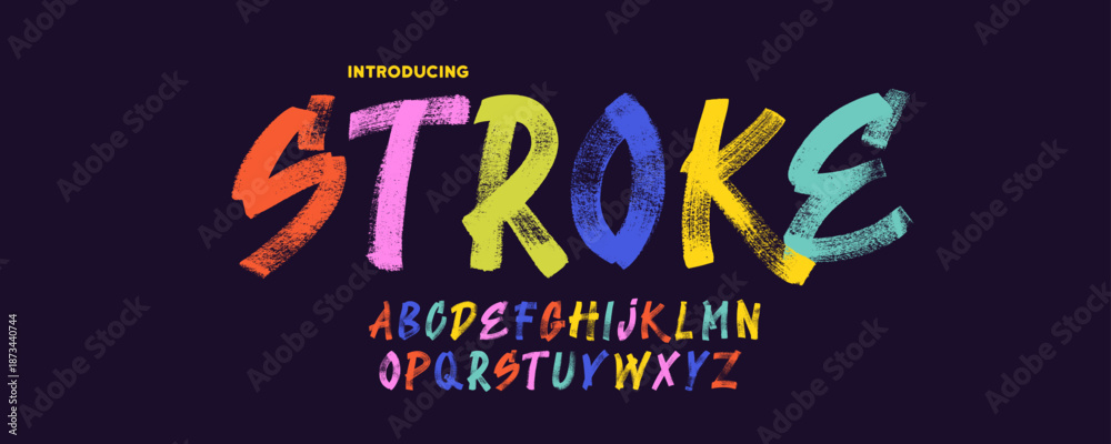 • Colorful grunge capital alphabet letters with dry brush texture. Hand drawn kid distressed bold font. Brush drawn letters, funky alphabet. Playful bold grunge font with rough stamp texture.