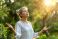 • Woman doing breathing exercises with closed eyes and raised hands, relaxing on nature. Calm girl enjoying fresh air, meditation with breathing, healthy yoga. Deep breath through nose for brain