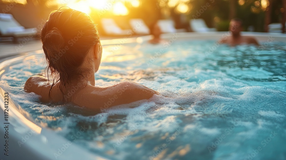 Relaks - Couple relaxing in hot tub at sunset, resort background. #1172412233