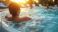 • Couple relaxing in hot tub at sunset, resort background.