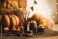 • Aroma reed diffuser, pumpkins, knitted warm sweaters, candles, dry leaves on wooden table. Concept of house decor, apartment seasonal fragrance. Thanksgiving. Autumn mood, cozy fall home atmosphere