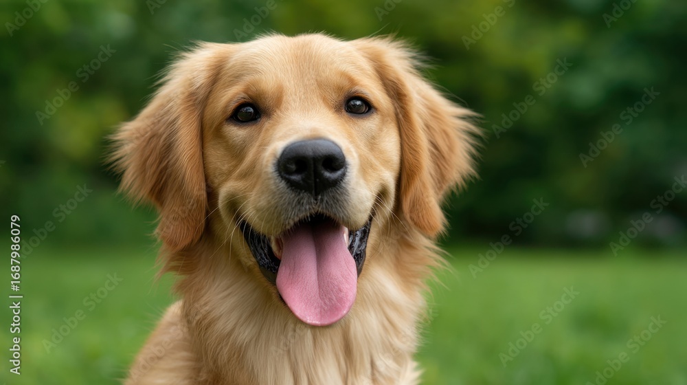 Relaks - Happy golden retriever sitting on green grass with playful expression and tongue out in a sunny... #1687986079