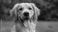 • Happy golden retriever sitting on green grass with playful expression and tongue out in a sunny outdoor environment showcased on a blurred nature background