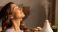 • Woman enjoying aromatherapy with a diffuser in a relaxing home environment.